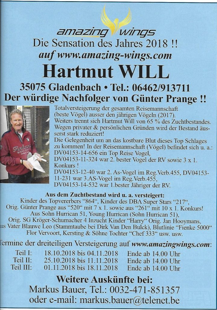 Hartmut Will has made the decision to step down a little bit in the future and to concentrate on a smaller travel and breeding team. The travel season 2019 is to be contested with a few then two-year-old pigeons and a manageable number of birds of the vintage 2018.