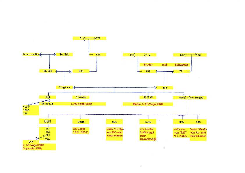 - At the SG Bremen / Schroeder / stage RV Gelsenkirchen 1894 win 2 grandchildren 864 young 6/6 prizes, one of them also a 1st prize. A good tribe also tolerates inbreeding: the close line or even inbreeding is still a double-edged sword. But why do you do it? One wants to manifest the positive qualities of the tribe or a line, and then bring about a “power explosion” through the hybrid effect with a dove of alien blood. Better than all the words, the two following graphs can show the inheritance strength of this line.Here therefore relatively detailed and not so far going back to the family tree of the “864” and his brothers. So you see here all too clearly the breeding strategy of Hartmut Will: Strengthen the capacity of the own strain through family breeding and then use the hybrid effect with corresponding “passers” for another power explosion.