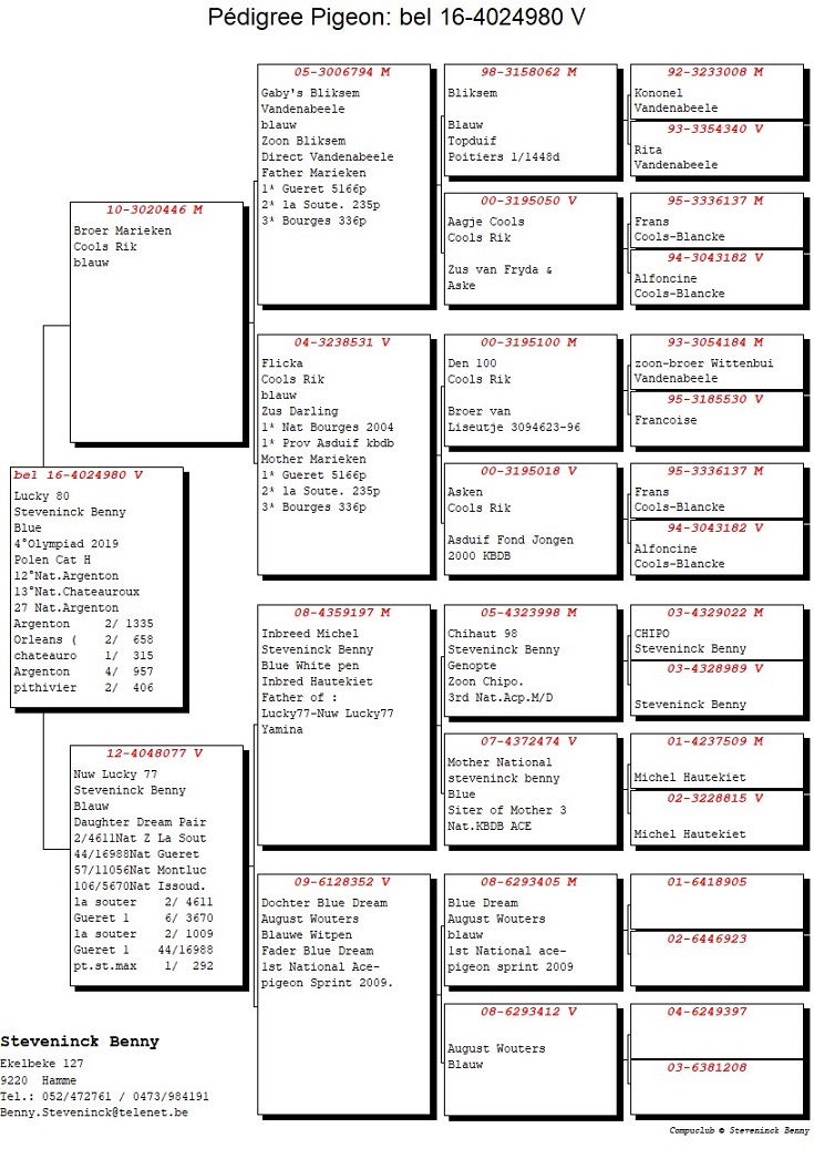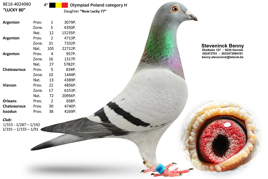 For me, the Lucky 80 B16-4024980 is one of the best hens in Belgium on the middle distance! Was she due to her previous top performances also the 4th Nat. KBDB Belgium AS pigeon for the olympic games in Poland in 2019 in the Cat. H.