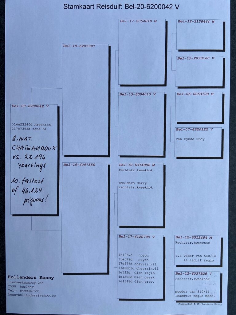 The 8th national vs. 22,196 yearlings (10th fastest of 46,824 pigeons) B20-6200042 was recorded by Kenny Hollanders at 2:19:41 pm