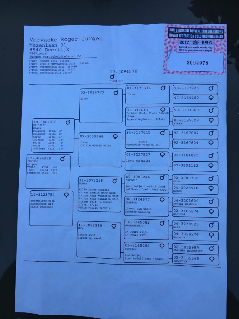 1.National yearlings vs. 26,881 pigeons were recorded in West Flanders at 13:47:31 clock with 1.141,8824 min./Meter at Roger & Jürgen Vervaeke from Deerlijk. It is also a magnificent bird with a very great pedigree. The super-old B17-3094978 is from his father’s side B10-3067010 “De 10” goes back to the famous “Bieke” by Rik Cools / Blancke. The mother is an Orig.Weibchen from the boyfriend Chris Debacker and comes from a full brother of “Christa” was 4th National AS-pigeon KBDB middle distance.