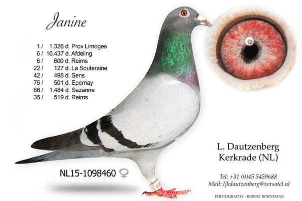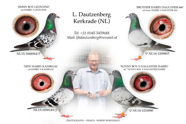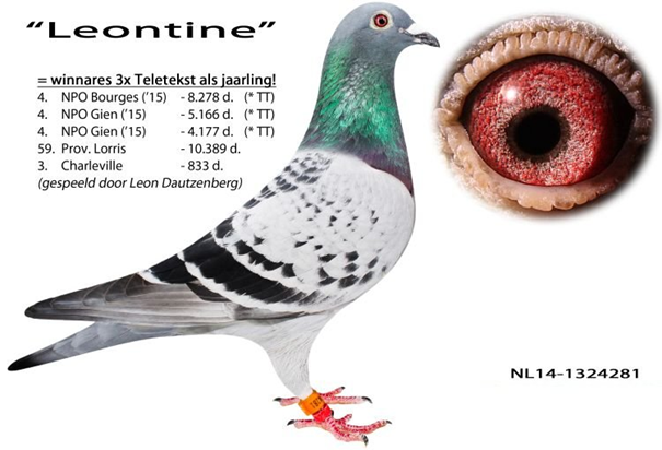 Ø Jan Hooymans aus Kerkdriel. Im Jahr 2009 kaufte Leon auf einem Verkauf in Thorn den „400“. Dieser ist der Vater der provinzialen Siegerin ab Limoges „Janine“.Danach kamen Kindern des „Davinci“ x „Bruder Harry“, „James Bond“, „Harry“ x „Kannibaaltje“ und aus dem Weibchen „Leontine“, die von Jan Hooymans bei Leon zurückgekauft wurde nachdem sie als Jährige dreimal auf Videotext stand. Sie flog jeweils den 4. Preis ab Gien gegen 4177 Tauben, Gien gegen 5166 Tauben und ab Bourges gegen 8278 Tauben. „Leontine“ wurde bei Hooymans an den weltbekannten „Harry“ und an einen „Bruder Harry“ verpaart.