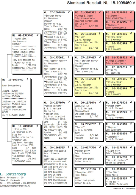 Grossmutter ist eine Halbschwester des „Harry“ aus „Bruder Harry“ – Vandenabeele / Zoontjens x“’Dirkje“ – Koopman. Ihre Mutter ist “ Bontje 880″ und stammt von Jo und Florian Hendriks. Grossvater ist der „Bonte Verkerk“ von „Gerard und Bas Verkerk (Linie“ Peter Pan „-“ Magnum „). Grossmutter ist die Tochter von „Super Boy“ der Gebr. Scheele x Tochter des berühmten „666“ von Henk Melis.