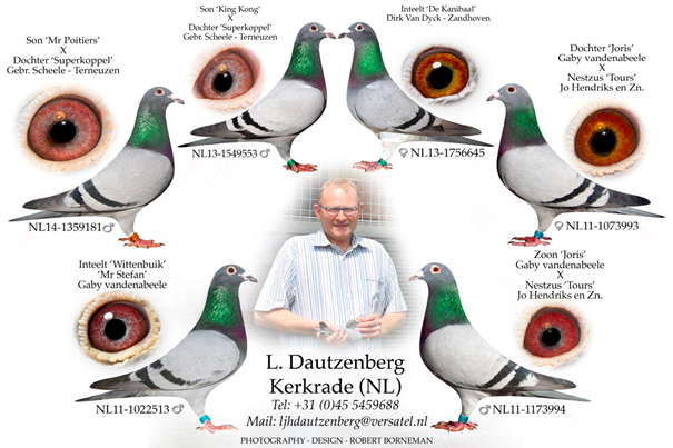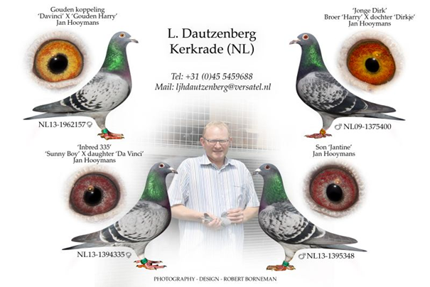 Ø Anton Ruitenberg aus Zwolle. Dieser Ausnahmer-Züchter ist Leons Aufmerksamkeit nicht entgangen und so wurde im Jahr 2013 der Kontakt gesucht. Seit dem wechselten Tauben aus den besten Heremans-Ceusters Tauben, aus dem „Wondere Dirk“ (Koopman), ein Enkel des berühmten „781“ (Vandenabeele) und vor kurzem wieder aus dem“ 781 „und weitere drei aus dem“ Wondere Dirk“ auf den Zuchtschlag von Leon Dautzenberg.